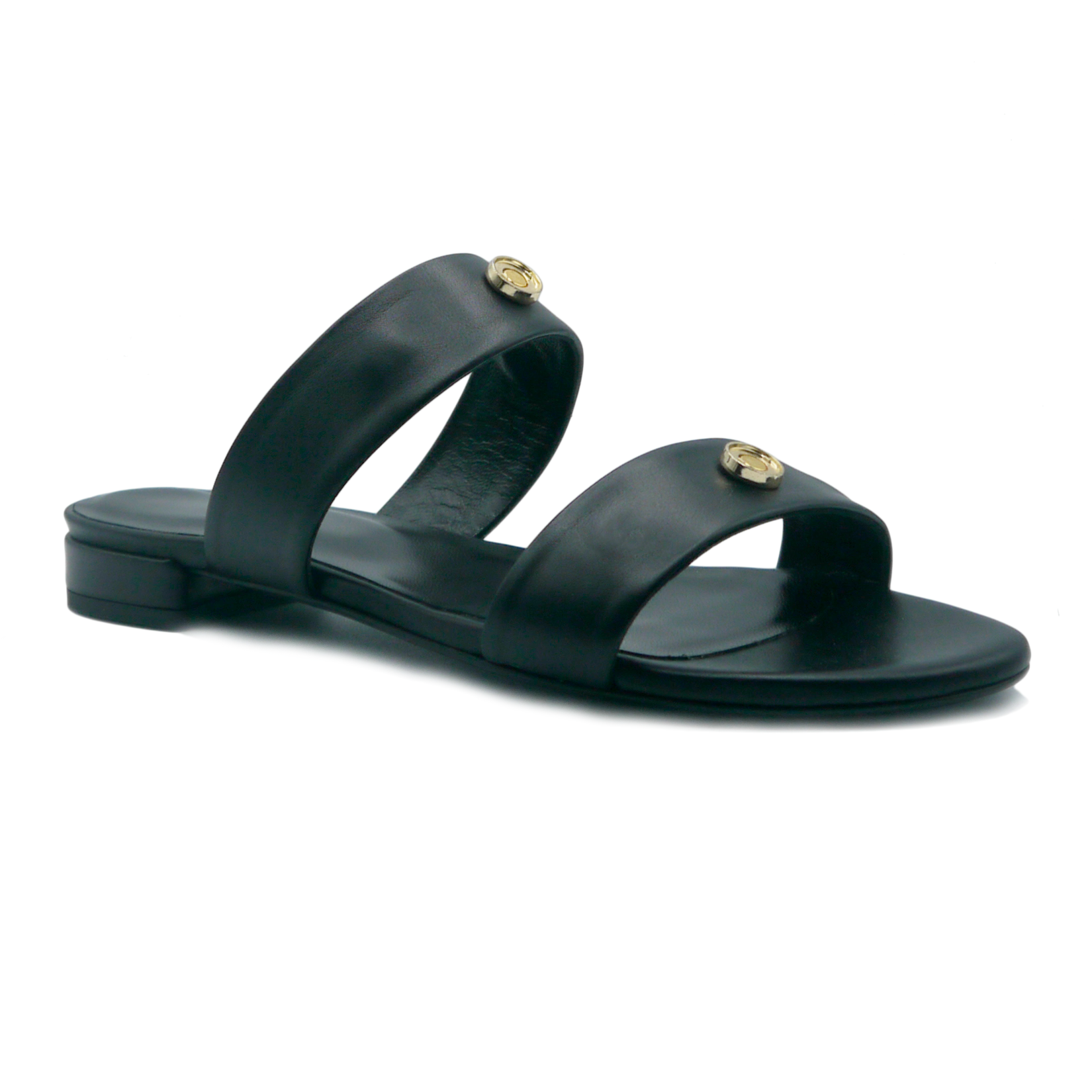 Realizzate in Italia da artigiani, in pelle di vitello nero morbidissimo, con due fasce. Su entrambe le fasce è presente un aggancio su cui applicare gli accessori gioiello.